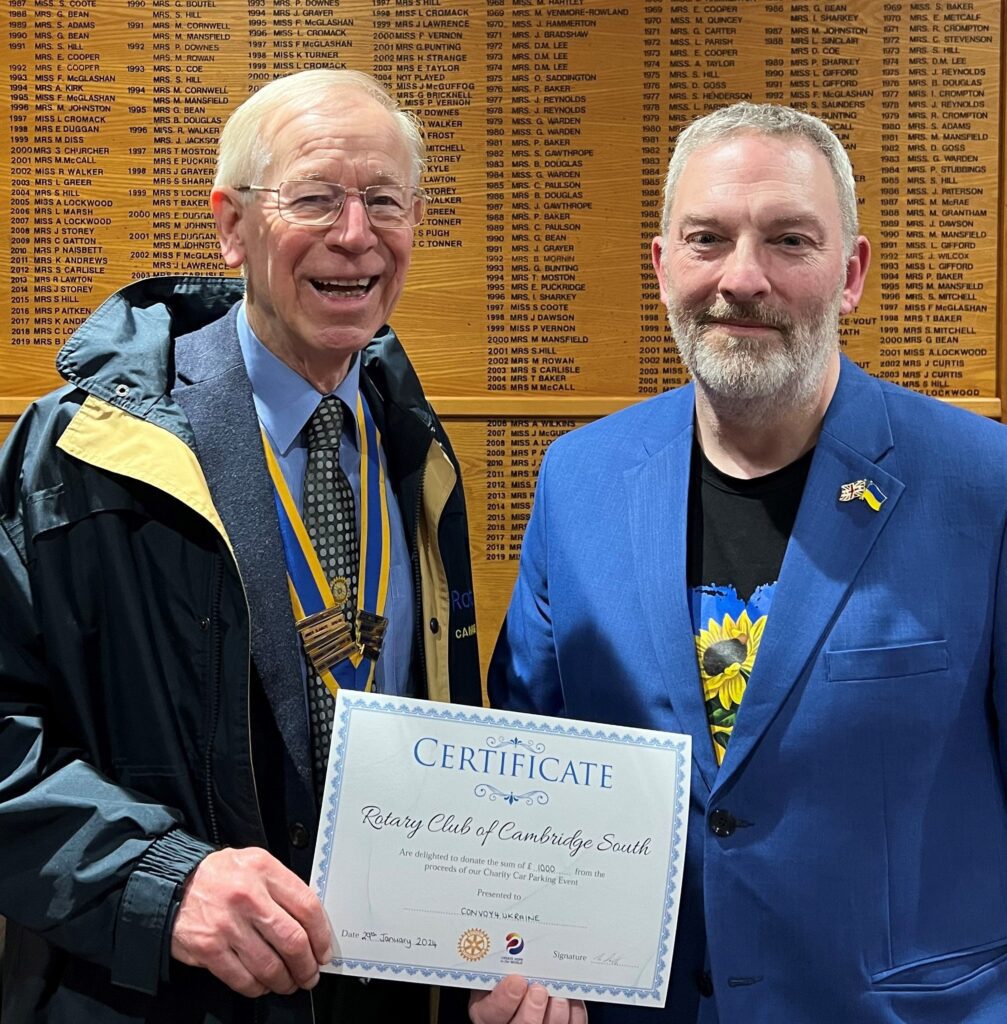 Rotary Club of Cambridge South President Mike Smith presented Convoy4Ukraine Chair Tom Walston with a cheque for £1,000.