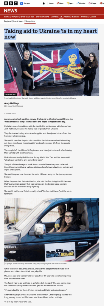 Press Feature October 24, 2024 Louis Mitchell BBC News: Taking aid to Ukraine ‘is in my heart now’, By Andy Giddings, BBC News West Midlands, 2 October 2024 https://www.bbc.co.uk/news/articles/crm2emgyv7lo