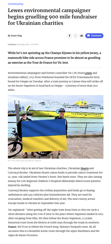 Press Feature May 20, 2025 Louis Mitchell Sussex Express: Lewes Environmental Campaigner Begins Gruelling 900-Mile Fundraiser for Ukrainian Charities, By Susan King, 20 May 2025 https://www.sussexexpress.co.uk/community/lewes-environmental-campaigner-begins-gruelling-900-mile-fundraiser-for-ukrainian-charities-5138116 Screenshot