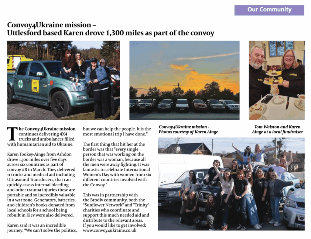 Press Feature May 28, 2025 Louis Stansted Flyer: Convoy4Ukraine mission – Uttlesford based Karen drove 1,300 miles as part of the convoy, by Ashley Huggonson, 28 May 2025 Local magazine The Stansted & District Flyer this month ran an article about our March 2025 convoy, in which “Uttlesford based Karen” took part. You can read the article online at their website.