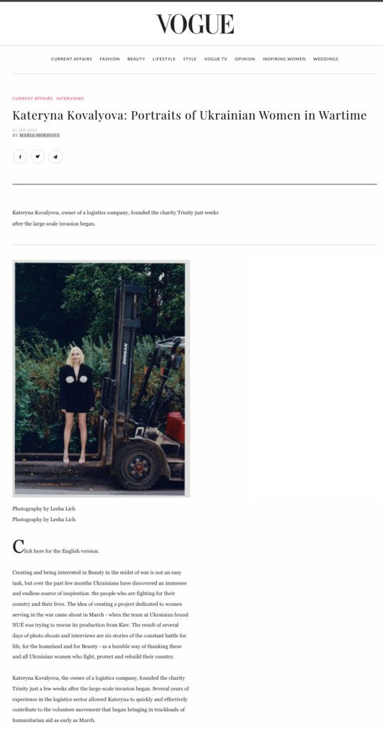 Friends of Convoy4Ukraine September 21, 2022 Louis Mitchell Vouge Portugal: Kateryna Kovalyova: Portraits of Ukrainian Women in Wartime, by Maria Mokhova, 21 September 2022 https://www.vogue.pt/retratos-mulheres-ucranianas-guerra-kateryna-kovalyova